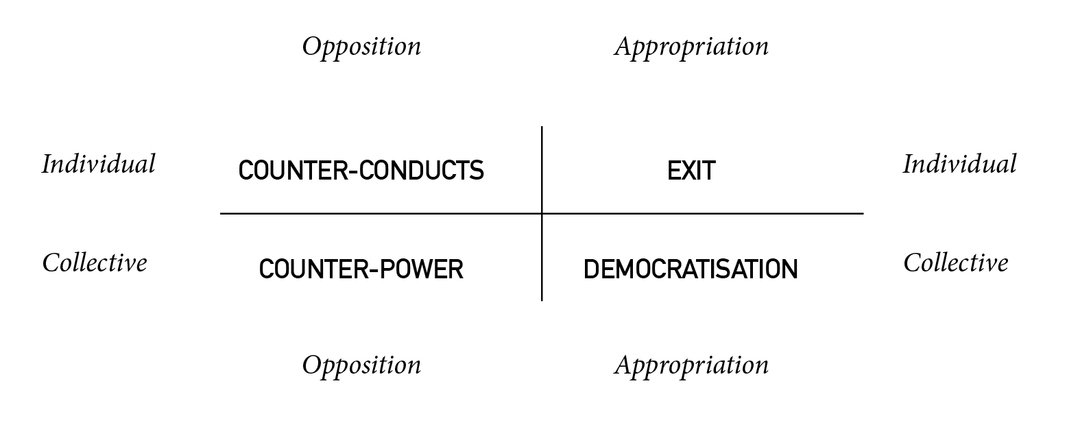 To contribute to this research agenda, we may list a set of different practices that platform workers adopt to exploit the limits of datafication. It is possible to identify 4 main bundles: counter-conducts, exit, counter-power, democratization.